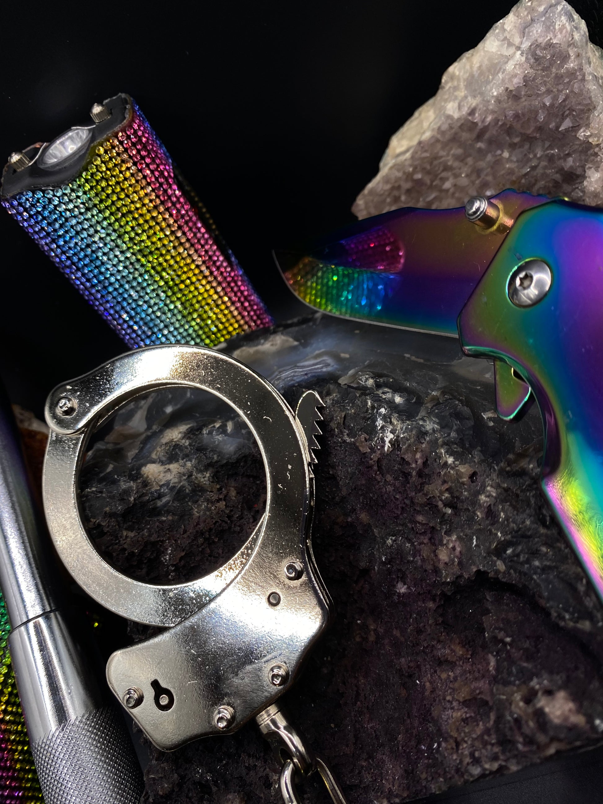 Five piece Personal Defense (PD) kit includes:a straight edge stainless steel blade with titanium coating handle, steel brass knuckles, mini taser, and 12β baton. Colors and type vary depending on availability.