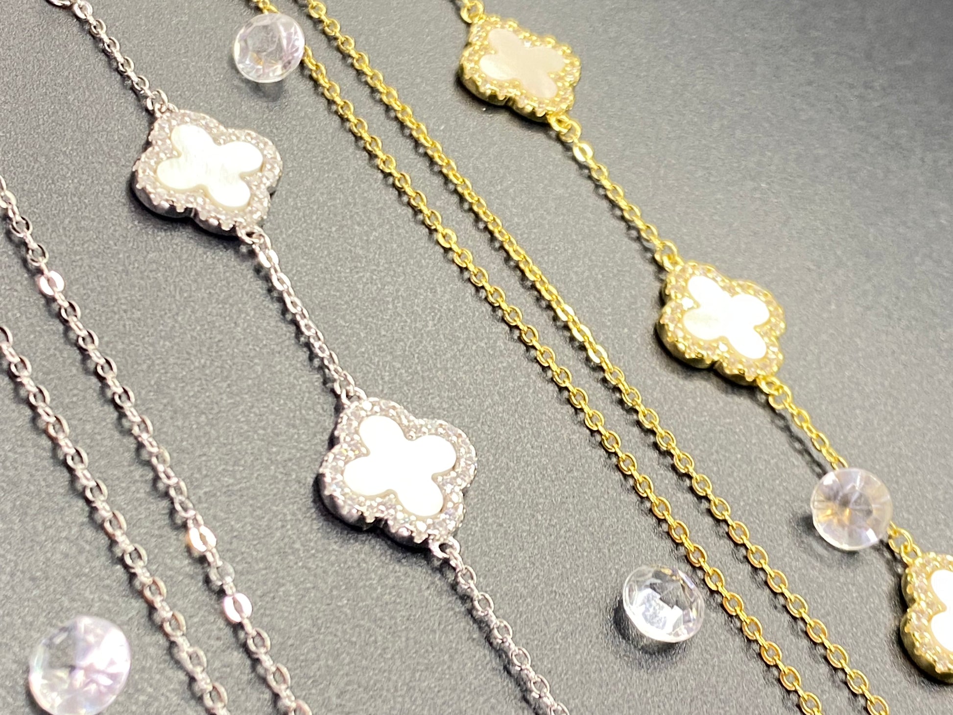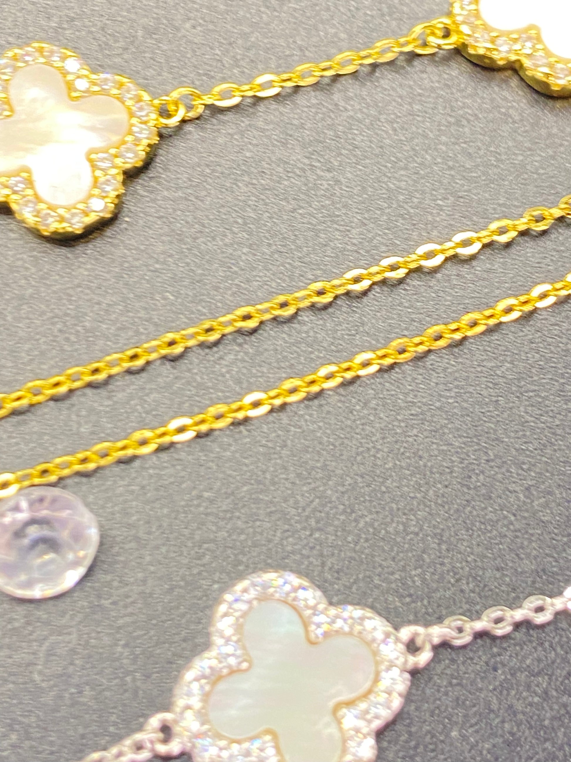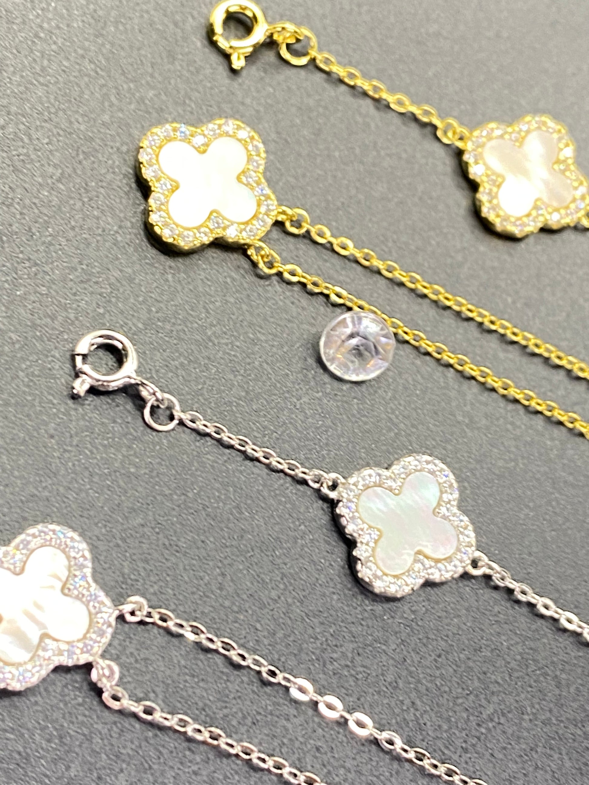 Discover timeless elegance with this enchanting four-leaf clover set, a symbol of fortune and grace. These crafted pieces feature the iconic clover motif adorned with rich agate stones. The finest craftsmanship with 925 sterling silver as the foundation, enhanced by luxurious rhodium and gold plating that creates a sophisticated two-tone finish. Delicate micro-insert detailing adds depth and dimension to every piece. Perfect for those who appreciate meaningful jewelry that blends classic design with contemporary allure. Get the necklace, bracelet or both as a great gift or personal treasure.