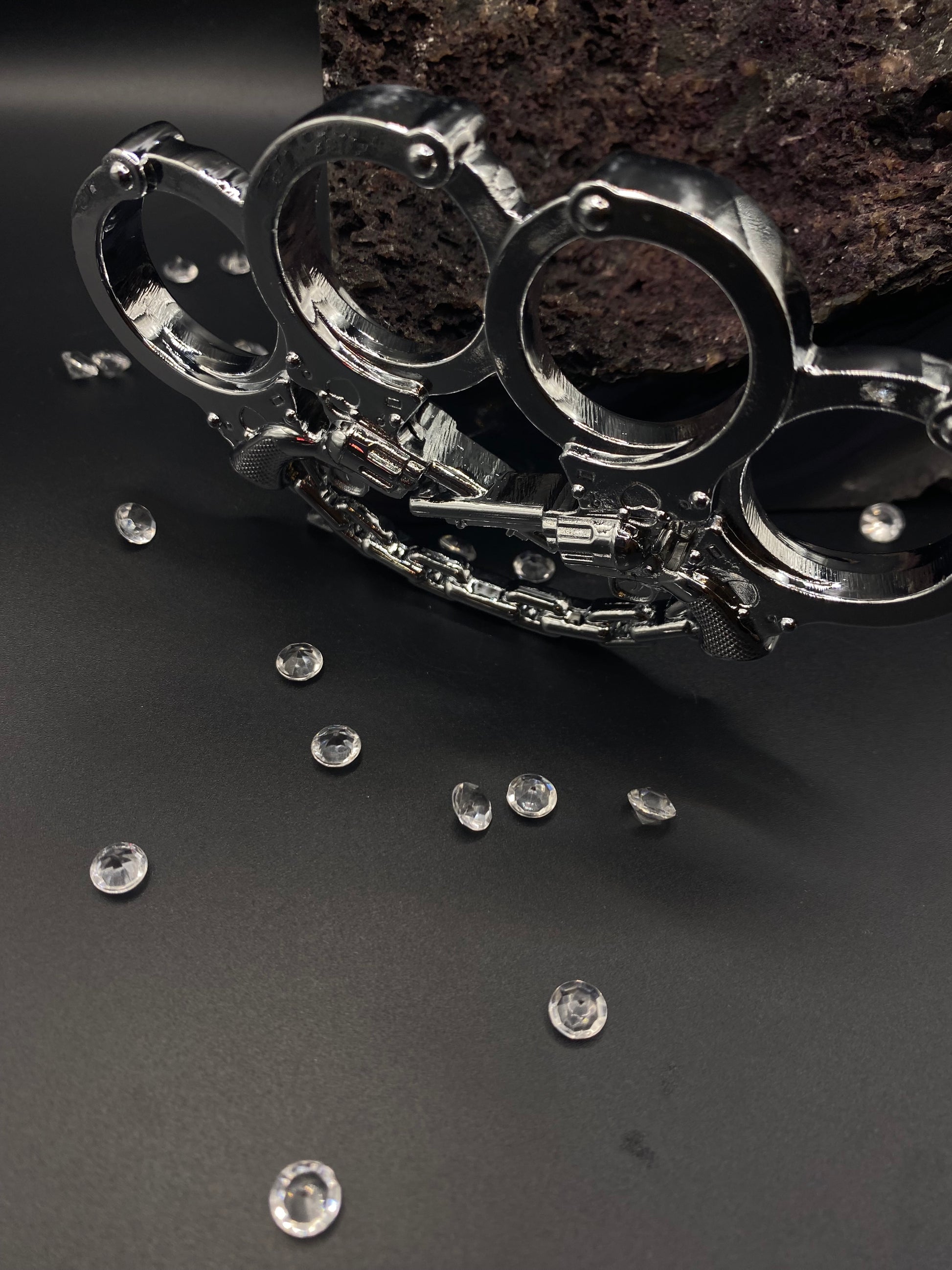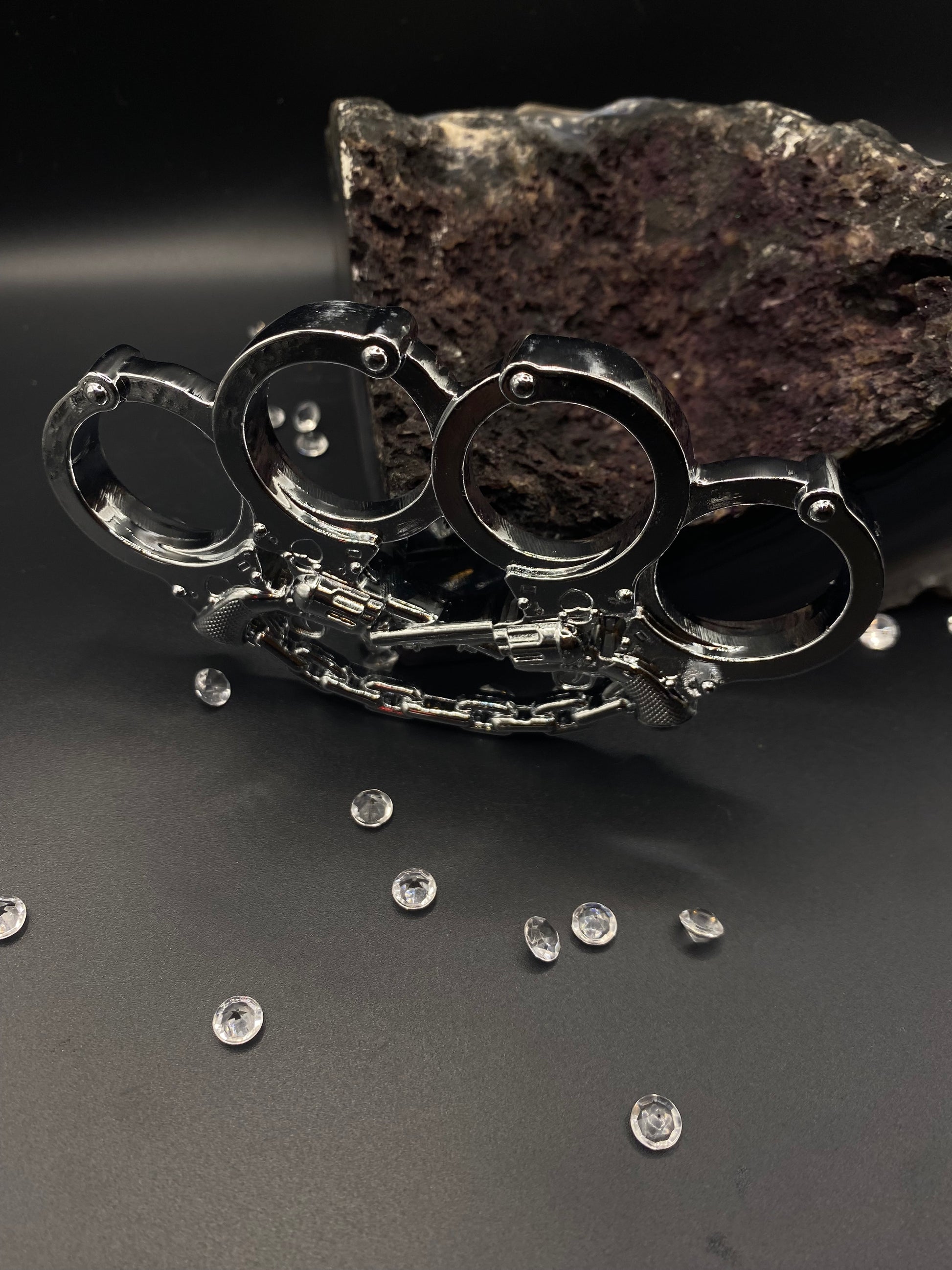 Gun Slinger Revolvers design, Double Six Shooter Crossed Pistols Knuckle Buckle with Handcuffs chain. Commonly referred to as "Brass Knuckles", these are Heavy Duty Belt Buckles, designed with "intended use" is to hold up your pants.