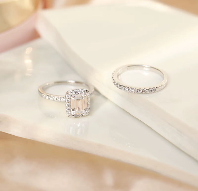 “Celebrate your promise with this vintage-inspired ring, crafted in sterling silver and adorned with a dazzling emerald-cut CZ stone for classic elegance and sparkle.”